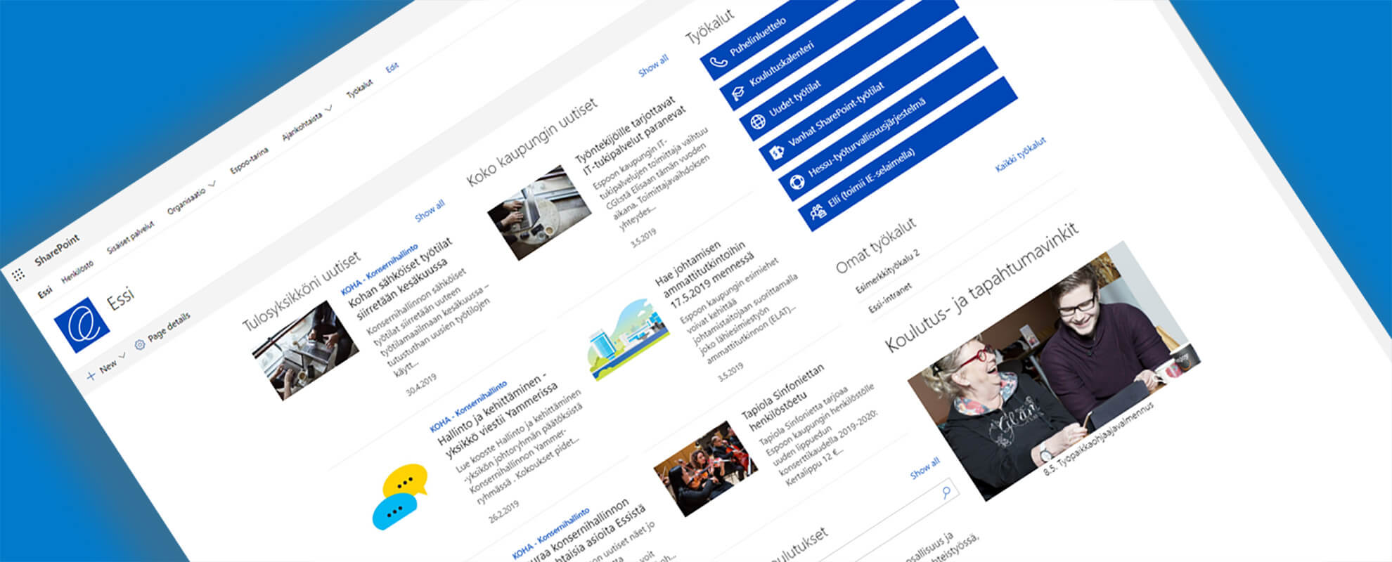 Espoon kaupunki uudisti intranetinsä modernien SharePoint-sivustojen päälle Office 365 -pilviympäristöön. Vuonna 2018 alkanut kumppanuus kanssamme tarjosi kaupungille modernin intran, mutta antaa myös jatkossa eväitä sisäisen toiminnan laajempaan uudistamiseen.