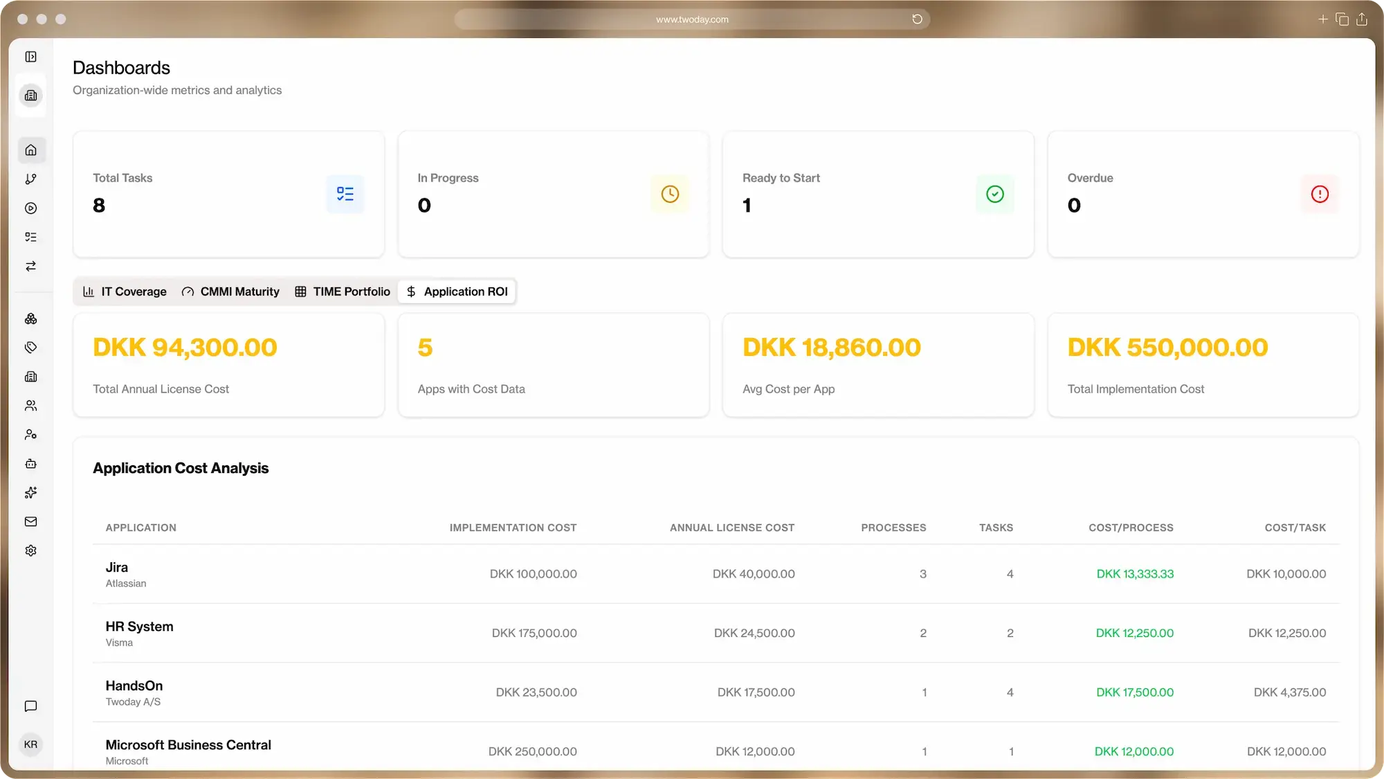 Built‑in dashboards, ROI analysis, and CMMI scoring let you prove impact and guide what to automate next.