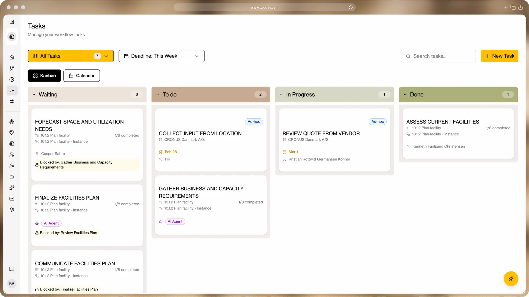 Turn steps into tasks, assign humans or agents, set rules and priorities, and track flow in real time.